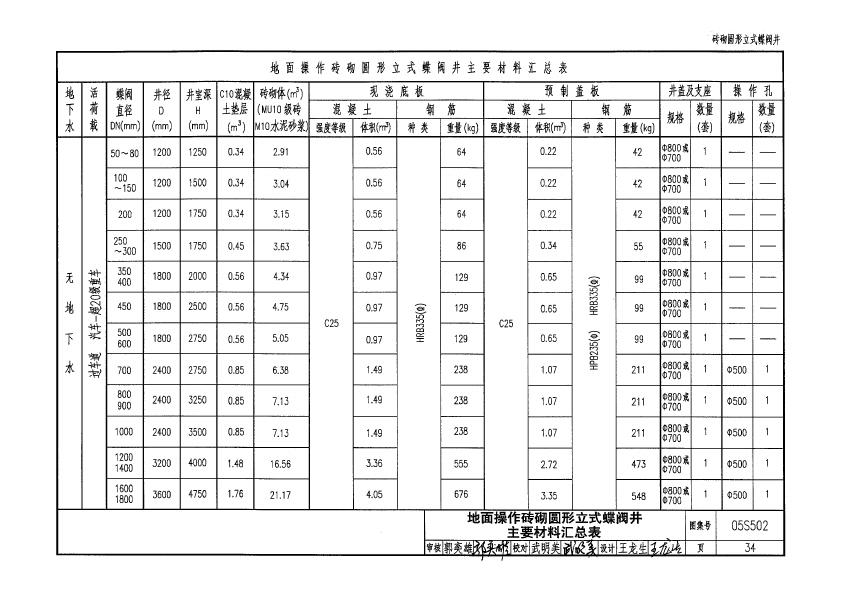 地面操作砖砌圆形立式闸阀井主要材料汇总表