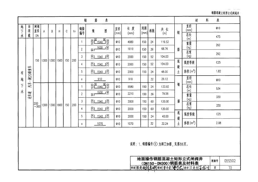 地面操作钢筋混凝土矩形立式闸阀井(DN150~DN300)钢筋表及材料表