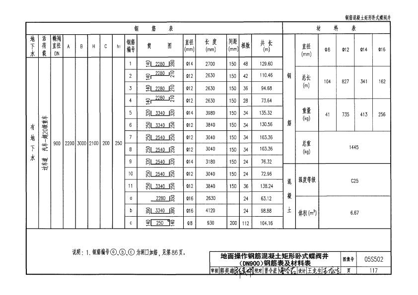 地面操作钢筋混凝土矩形卧式蝶阀井(DN900)钢筋表及材料表