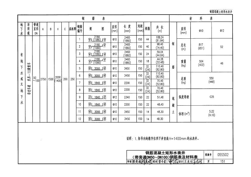 钢筋混凝土矩形水表井(带旁通DN150)钢筋表及材料表