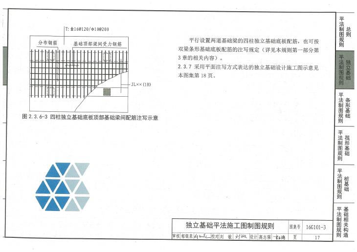 16g101-3图集是对11G101-3《混凝土结构施工图平面整体表示方法制图规则和构造详图(独立基础、条形基础、筏形基础及桩基承台)》的修编。本次修编按GB 18306-2015《中国地震动参数区划图》、GB 50011-2010《建筑抗震设计规范》及2016年局部修订、GB 50010-2010《混凝土结构设计规范》(2015版)等新标准,结合近年来工程实践对图集提出的反馈意见,对图集原有内容进行了系统的梳理、修订,同时考虑实际工程应用需要又新增了混凝土灌注桩等内容。